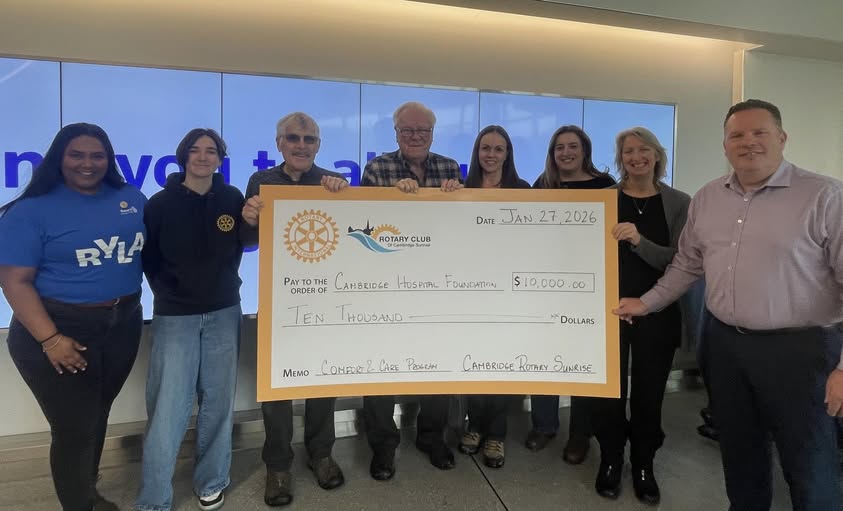 In January 2026, our members were happy to present Cambridge Memorial Hospital Foundation with a donation of $10,000 to support the purchase of 14 stretchers, an ECG machine, an ice dispense for the labour & delivery floor, and ongoing staff education. Rotary Cambridge Sunrise has been a long time supporter of CMH, and our first donation was $5k in 1996 towards Oncology. To date, with this gift included, that’s a cumulative total of $106,900 over the past 30 years. We extend our gratitude and appreciation to the staff and volunteers at Cambridge Memorial Hospital and the Cambridge Memorial Hospital Foundation.